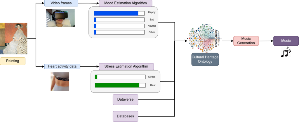It all starts while you engage with a cultural artifact (for example, a painting or video). During this interaction your facial expressions and heart activity are recorded. Our AI models analyze this data to detect your mood and stress levels in real-time. Meanwhile, this data is enriched with context from the Cultural Heritage Knowledge Graph, which adds contextual information like keywords, historical period, and themes based on what you explore. Finally, a piece of music tailored to your emotional state and experience is synthesized and played.